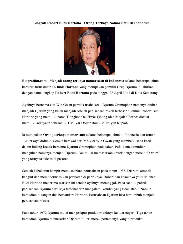 Biografi Robert Budi Hartono - Orang Terkaya Nomor Satu Di Indonesia ... Biografi Robert Budi Hartono - Orang Terkaya Nomor Satu Di Indonesia (Sumber : Biografi Orang Hebat, Link : http://biografi-oranghebat.blogspot.com/2014/07/biografi-robert-budi-hartono-orang.html)